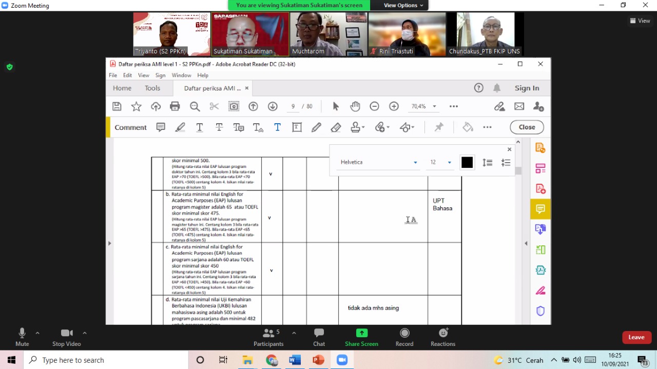 S2 PPKn UNS kembali menggelar audit mutu internal (AMI) sebagai agenda rutin tahunan. AMI diselenggarakan pada hari Jumat, 10 September 2021 dan Senin, 13 September 2021. Tujuan AMI adalah untuk memastikan seluruh proses yang ada di S2 PPKn telah memenuhi standar mutu yang telah ditetapkan oleh peraturan yang berlaku. Bertindak sekalu Auditor dari LPPMP yaitu Dr. Sukatiman dan Dr. Chundakus dari Prodi PTB. Hasil audit merekomendasikan S2 PPKn untuk merekap bukti-bukti kinerja dalam google drive yang dikelola oleh prodi sendiri. Selama ini bukti-bukti kinerja S2 PPKn disimpan diberbagai platform yang ada di UNS seperi siakad, OCW, IRIS, dll.