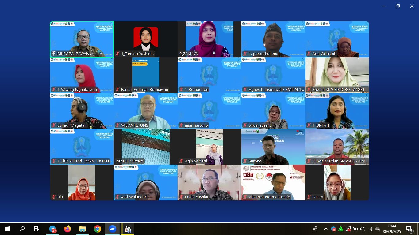 Pada hari Selasa, 30 September 2025, Prof Dr. Winarno, M Si, salah satu dosen S2 PPKn FKIP memberikan materi Kegiatan Pengabdian pada Masyarakat dengan topik Pengalaman Belajar 3 M dalam Pendekatan Pembelajaran Mendalam pada forum Musyawarah Guru Mata Pelajaran (MGMP) mata pelajaran Pendidikan Pancasila jenjang SMP Kabupaten Magetan. Kegiatan dilakukan secara daring dalam format kegiatan Webinar Series yang diselenggarakan atas kerjasama MGMP Pendidikan Pancasila SMP Magetan, Dinas Pendidikan Kabupaten Magetan dan Prodi S2 PPKn FKIP UNS. Narasumber lain adalah Wijianto, M.Sc yang juga dosen PPKn FKIP UNS. Materi dan sajian dari Narasumber dapat dilihat di link berikut. Kegiatan kerjasama ini semoga dapat berlanjut di masa mendatang.